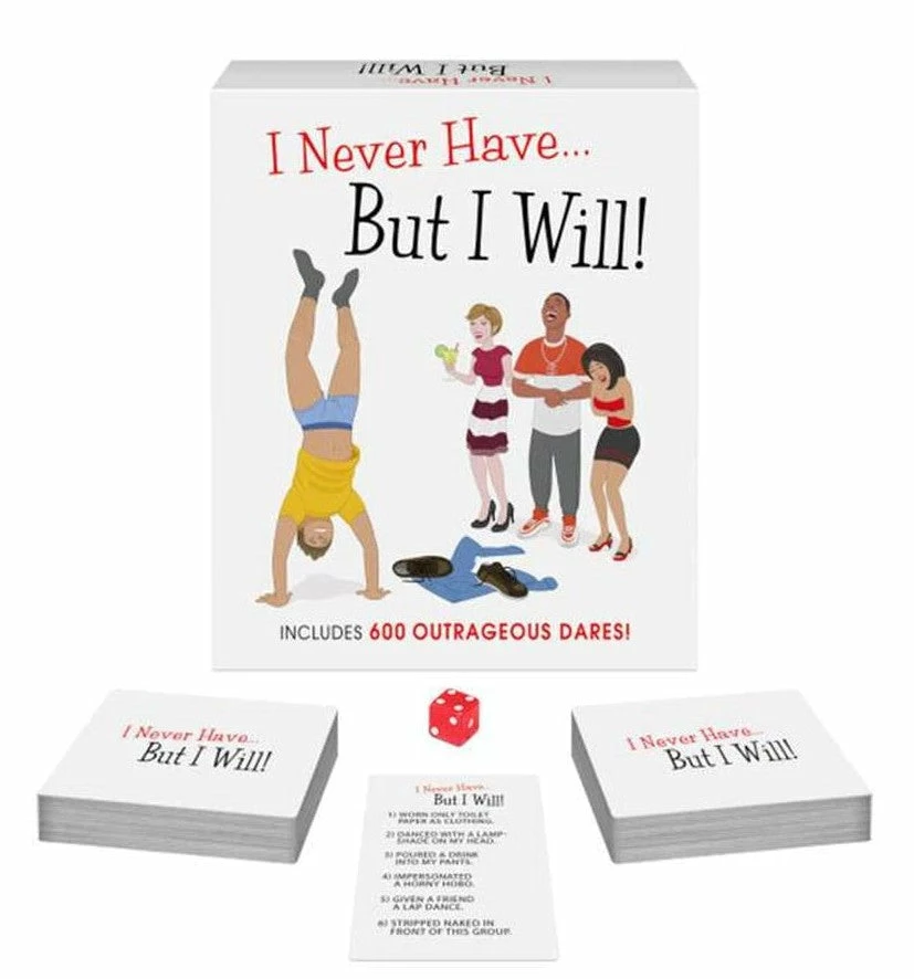 The crass party game with over 600 DARES! After an I Never Have statement is made, players indicate who of them have never done the action. The first of these players who announces, βBut I Willβ then acts out the dare and earns the card as a point. Play for points or as a drinking game! You can even offer a prize to the winner, such as candy, wine, a back rub, or a spanking! Includes: a die and 100 dare cards.