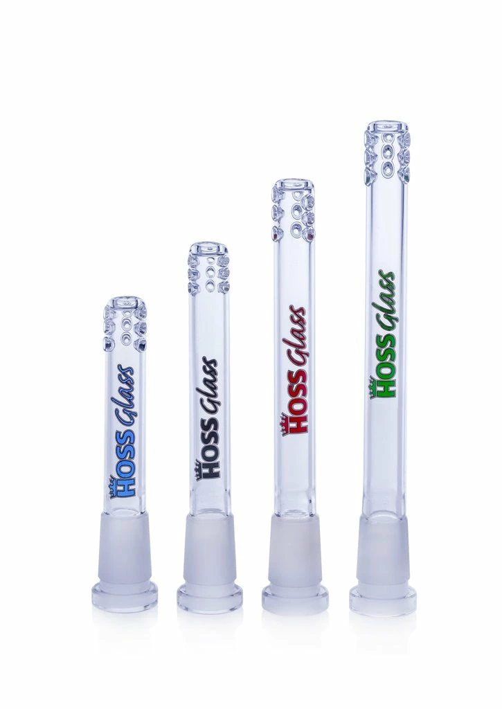 The Hoss Glass Diffuser Downstem is here.ย These downstems have small holes at their ends to diffuse the smoke as it enters your bong.ย The clear glass with colored logo gives it a clean look.