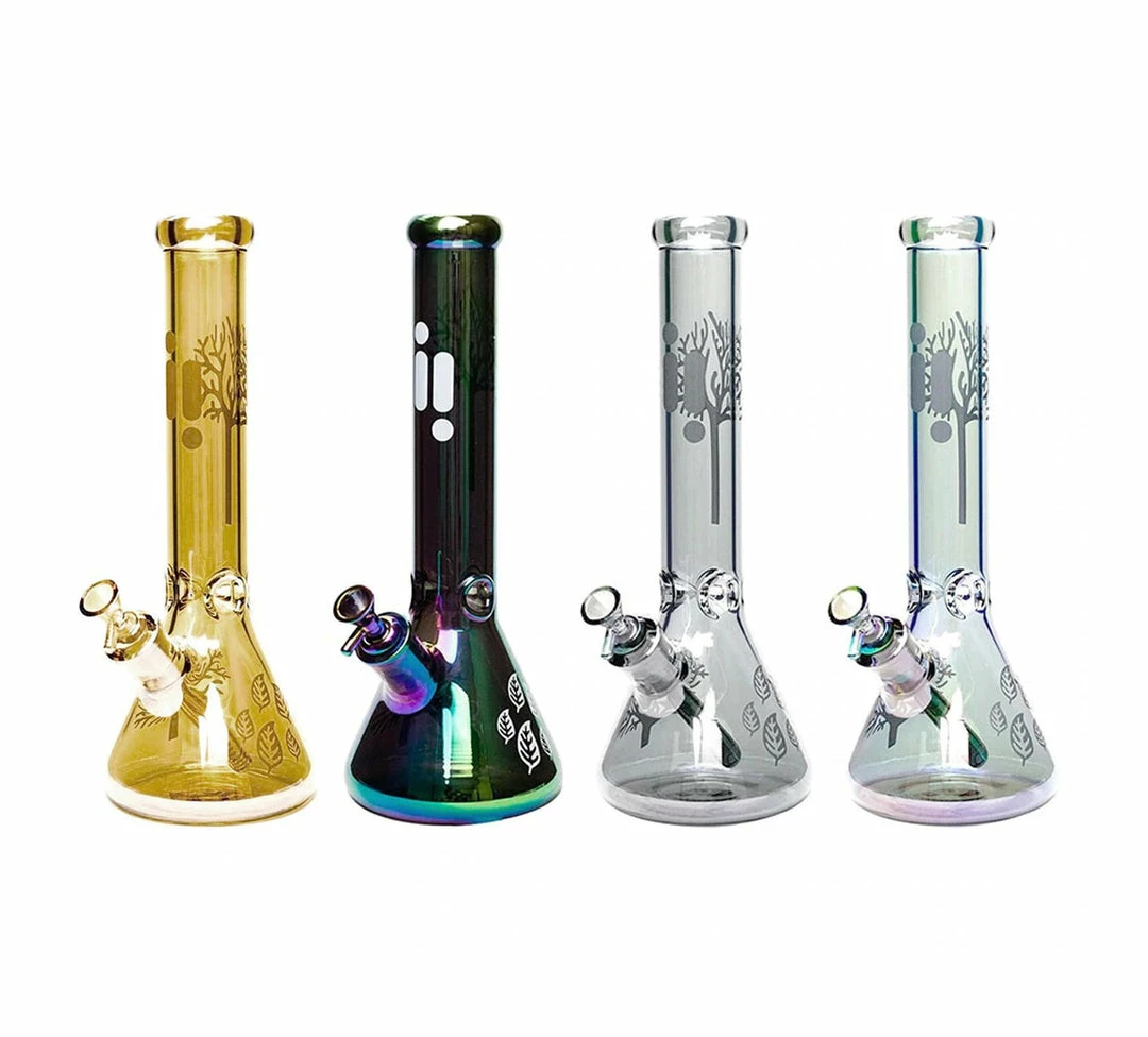 These glass water pipes stand 14 inches tall and features colourful chromatic colours with tree decals and the Infyniti Glass logo. These beakers have a built-in 3-pinch ice catcher which makes for cooler, smoother hits. Includes a matching 14mm glass herb slide and removable downstem that measures 5.5″ long.
