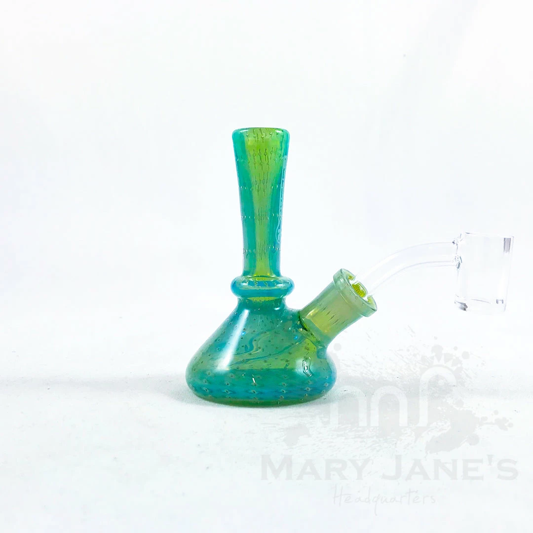 These miniature fumed dab rigs come in various colours and feature a fused downstem concealed within an opaque, beaker-shaped body. These water pipes measure 4 inches tall and include a 10mm male quartz banger.ย Sold in assorted colours which may vary from images.
