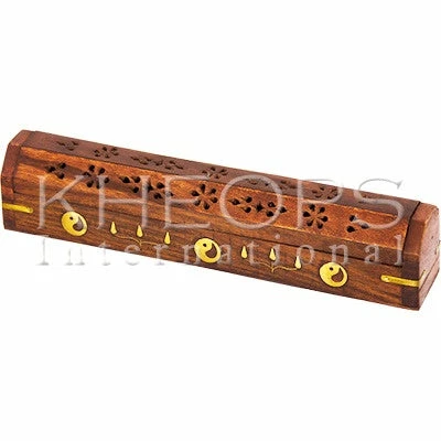 Our beautiful wooden incense storage box, with decorative brass inlays, burns incense sticks and has 2 brass plate insets for cone burning. It also has a storage compartment for keeping your favorite incense clean and safe. Stylish cut outs allow the incenses smoke to slowly escape and fill the air with your favorite scent.ย SYMBOL:ย Yin-Yang represents the two great opposite but complementary forces at work in the cosmos. Yin is the female principle, it is cold, dark, receptive, soft, small, and still. Yang is the male principle, it is bright, active, upward, hot, creative and strong. The shape of the yin and yang sections of the symbol give a sense of the continuous movement of these two energies, yin to yang and yang to yin. This movement is seen as the cause of all creation