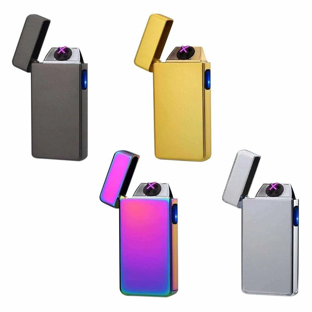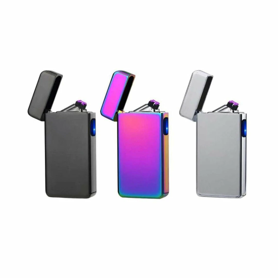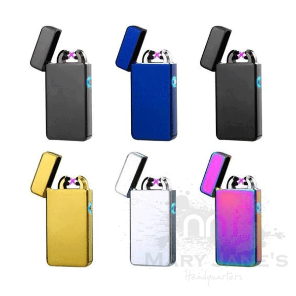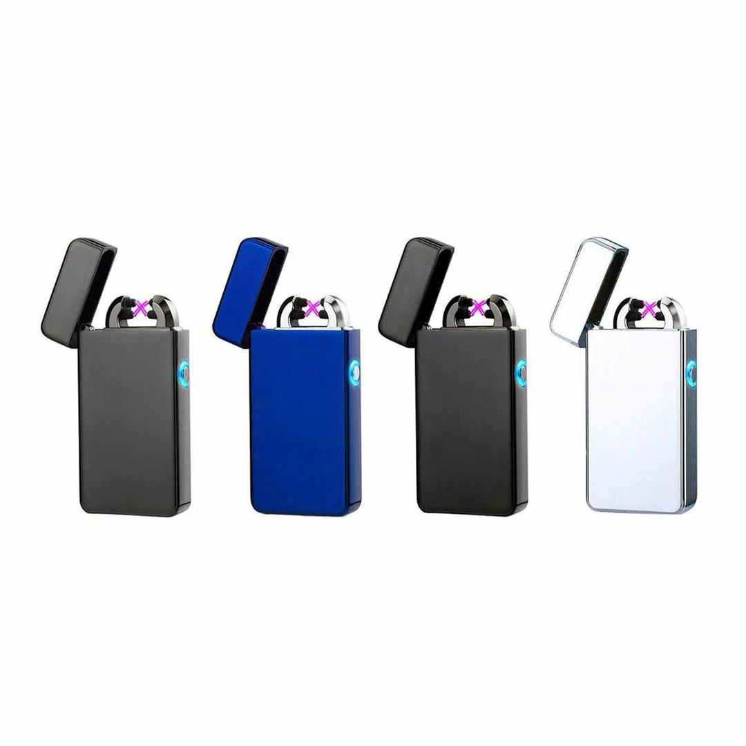 A plasma lighter known by various names such as electric arc lighter or electric lighter. Simply press the button and ignite two plasma beams which are hotter than a typical lighter flame. Electric lighters are windproof and do not need to be refilled with butane or lighter fluid. This dual crossing two beam lighter produces tilted-angle plasmas which increase the contact area compared to straight/vertical arcs. This creates an ample contact surface and means bigger items like full size cigars and bowls can easily be sparked with it.