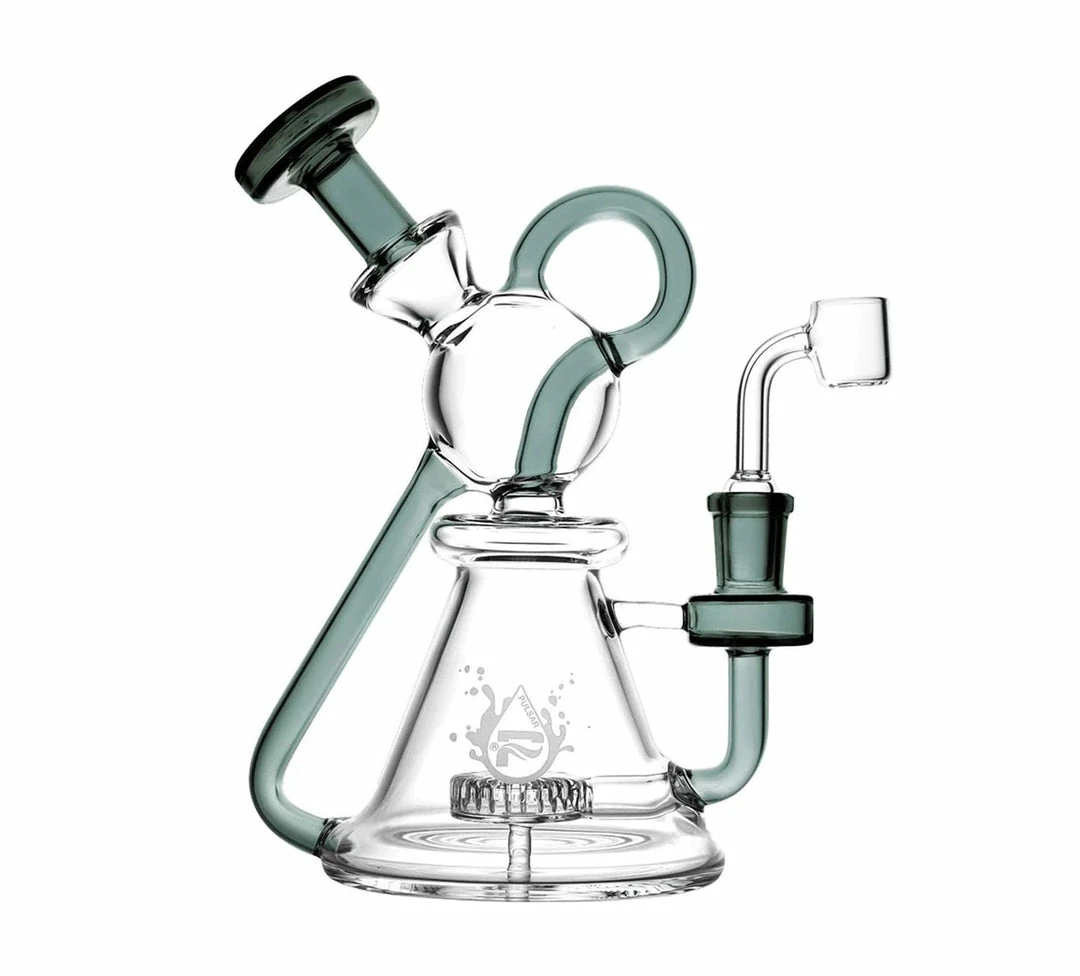 The Pulsar Klein Recycler Dab Rig features a fixed downstem with a cerc perc that filters hot vapour as it travels up through the beaker-shaped base. The recycling Klein design keeps water cycling through for smooth hits and prevents splashback. The rig stands 8 inches tall and features a 14mm female joint. Includes a 14mm male quartz banger.