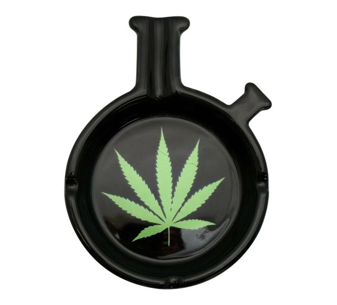 This 6″ ashtray features a classic water pipe shape with green leaf decal on the bottom.