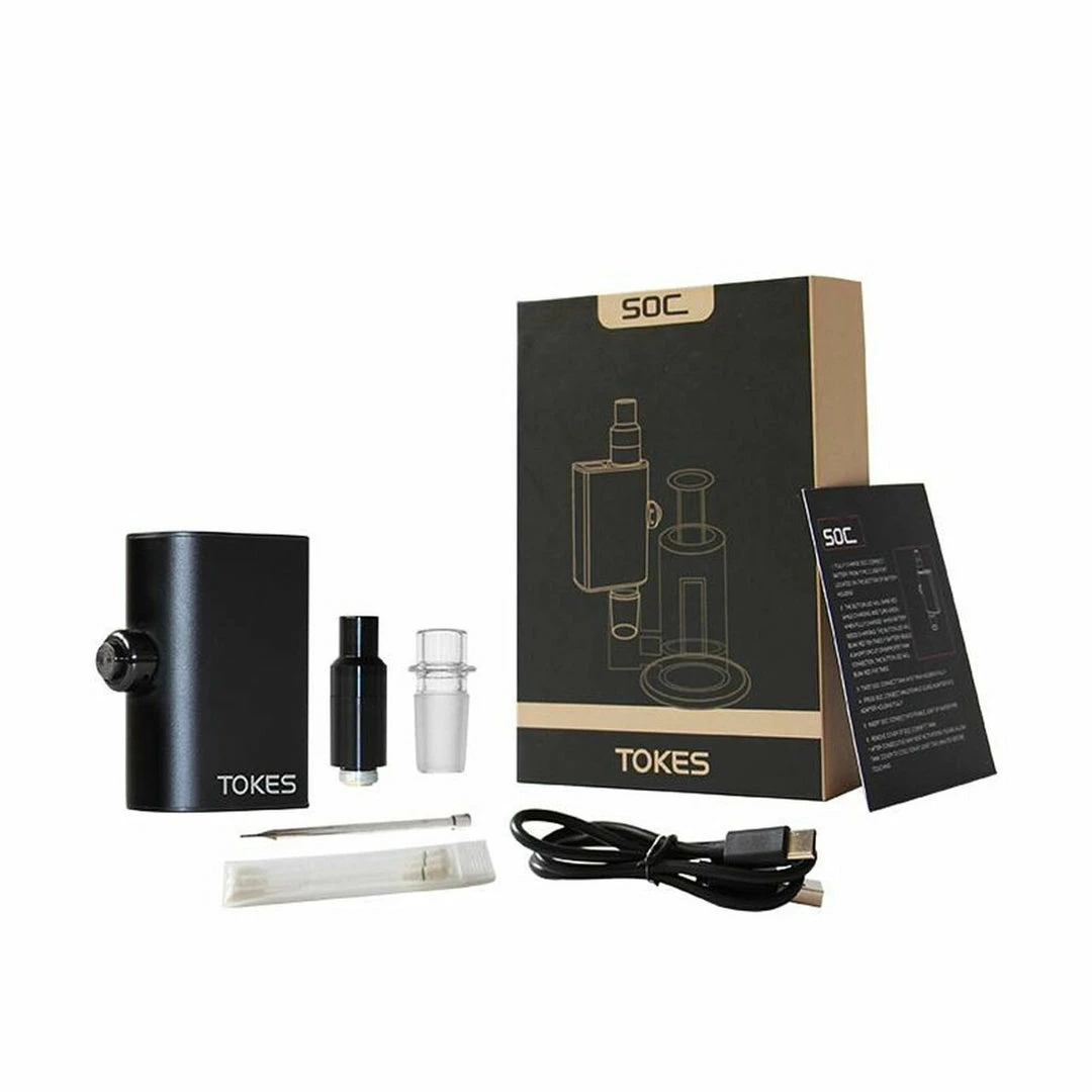 Theย SOC Tokes from Green Light Vapes is a dual use wax vaporizer with a 14mm male water pipe adapter that makes this vape compatible with most water pipes. The SOC Tokes has 2 mode options use for wax or mod for E-liquid, anย adjustable flow hole will make you enjoy better smoking with big vapour and no burn out.ย The battery features a 650mAh capacity and has three adjustable voltage settings;ย 3v(Blue), 3.5v(Green), 4v(Red). The SOC Tokes vape has a magnetic mouthpiece and a type-C USB charging cable.