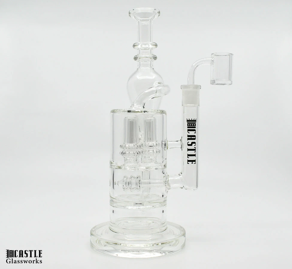 This 12″ tall Castle Glassworks dab rig consists of three showerhead percolators on top of an inline perc as well.