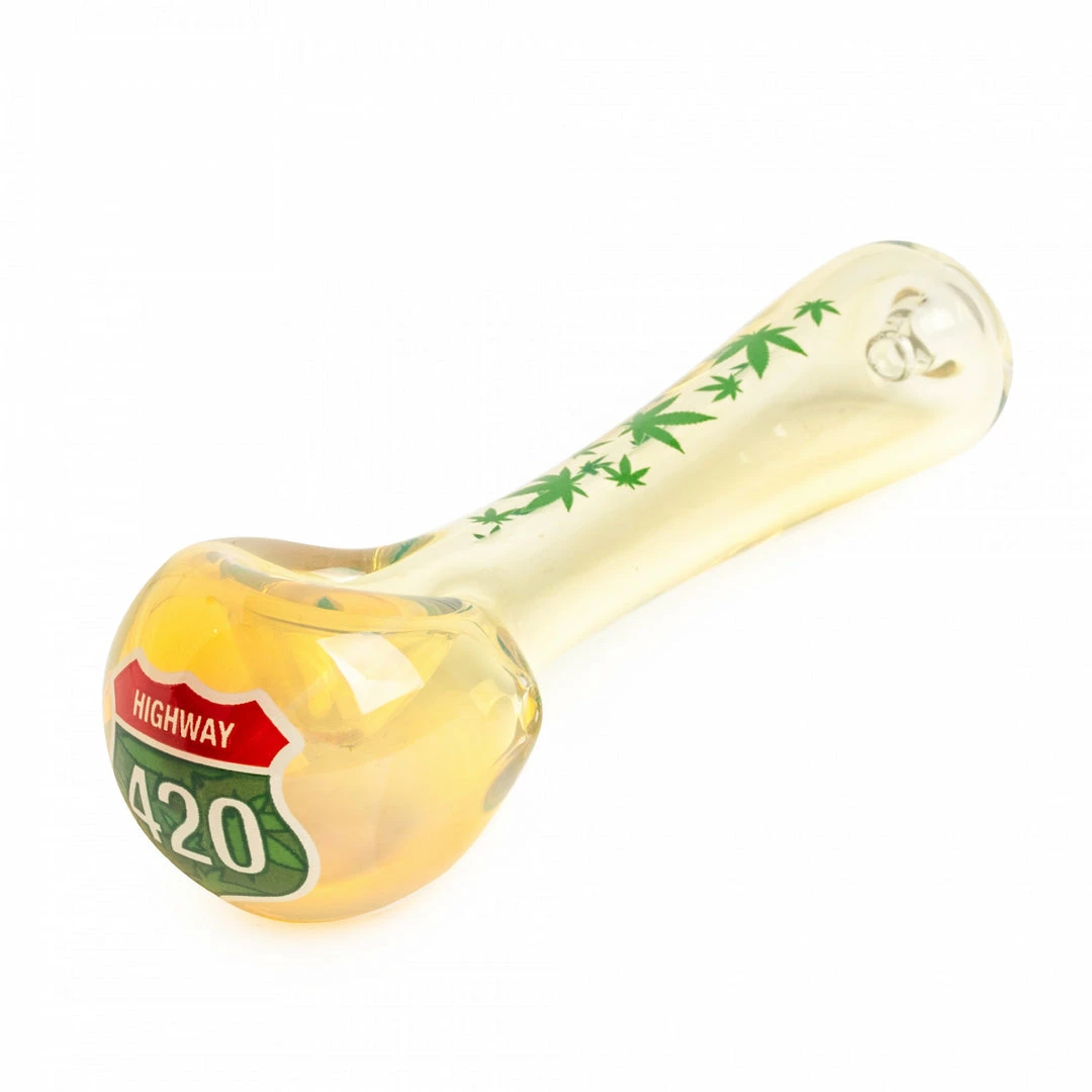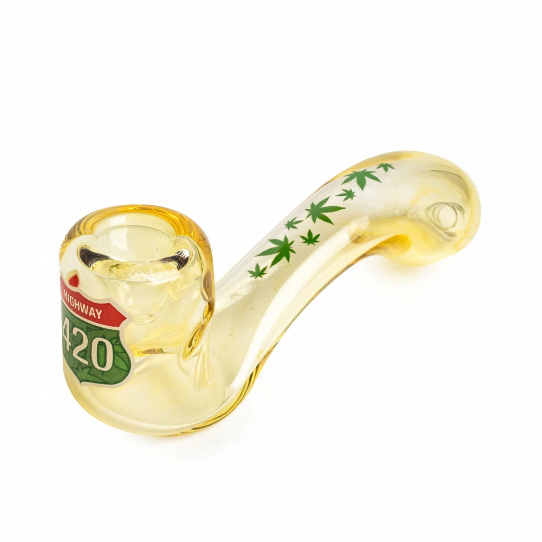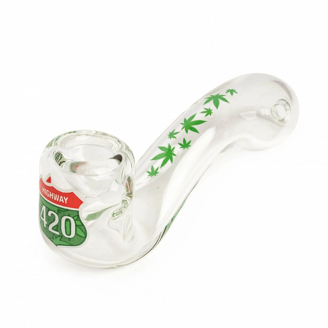 Looking to take the scenic route to Highway 420? These Red Eye Glass® Hand Pipe come in collectible tins with a foam insert that keeps your pipe safe and secure. Each pipe is made of 100% borosilicate glass with a signature Highway 420 decal and a flat freestanding base to easily load your next toke. Just remember, green means go!