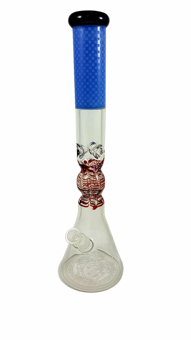 These 18″ tall Beaker Bongs from Legendary Glass have a Jade Blue checkered colored top with a sandblasted bottom and textured mid grip. These pieces are a great addition to any collection.