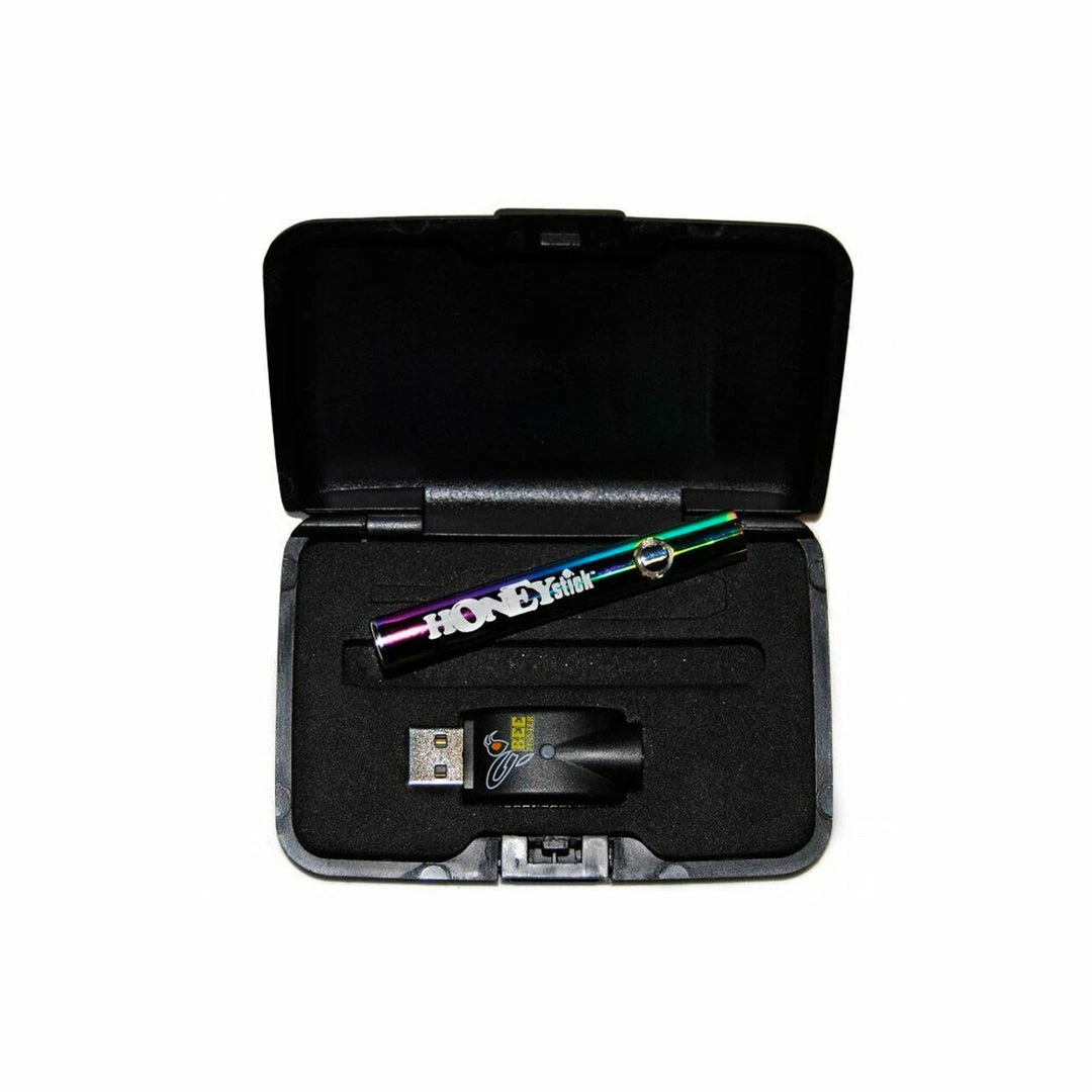 The Bee Master by HoneyStick is a powerful, stylish multi coloured vape battery for 510 thread pre filled oil vape cartridges. These little vapes comes in a sleek and thin wallet case with cutouts for storing the battery, USB charger, and vape cartridge. The case is a High gloss Black with a smooth high quality finish with a buckle clip to lock it secure for transport when on the go.