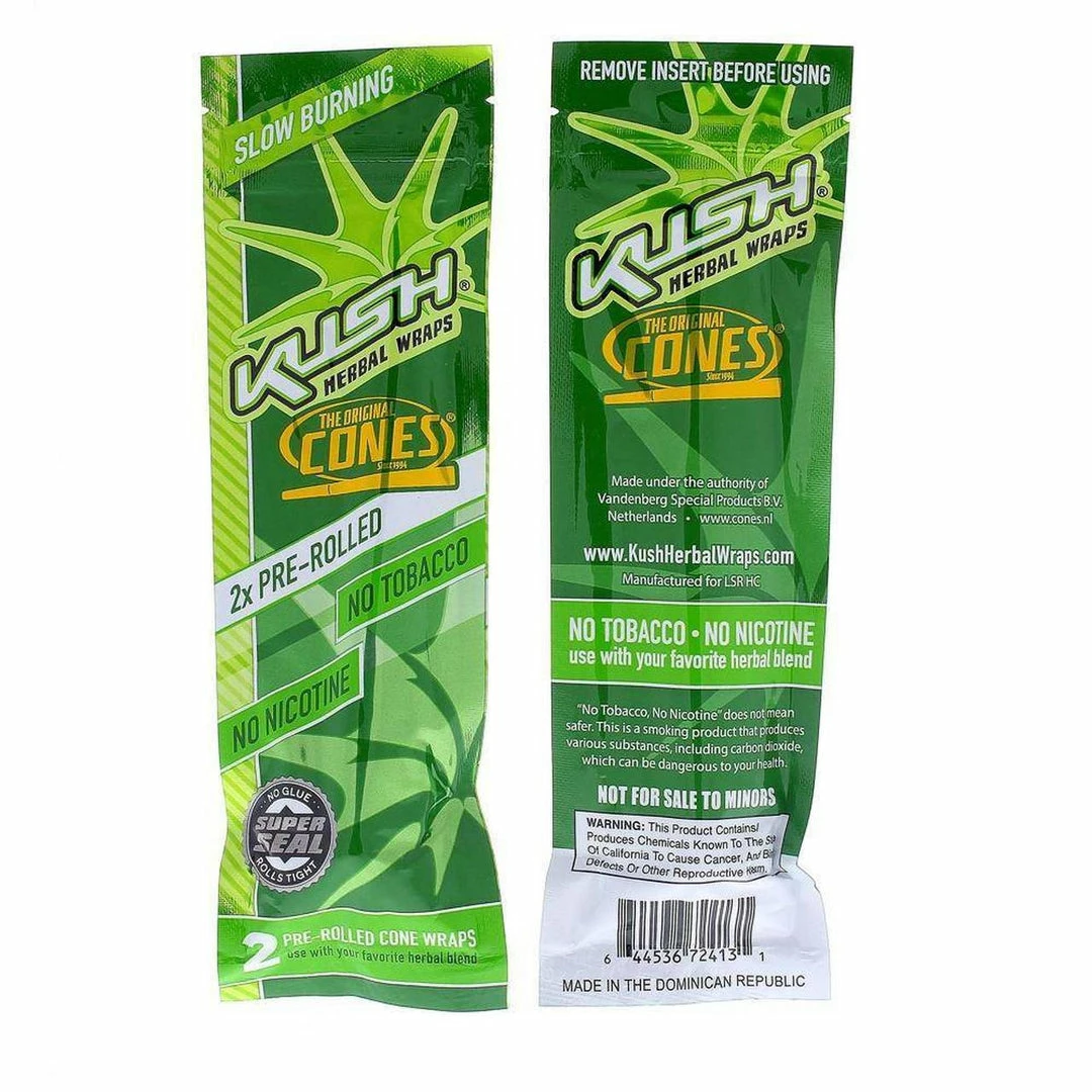 Kush Herbal Hemp Wraps comes in a pack of 2 wraps and are made with 100% Canadian Hemp and are nicotine and tobacco free.