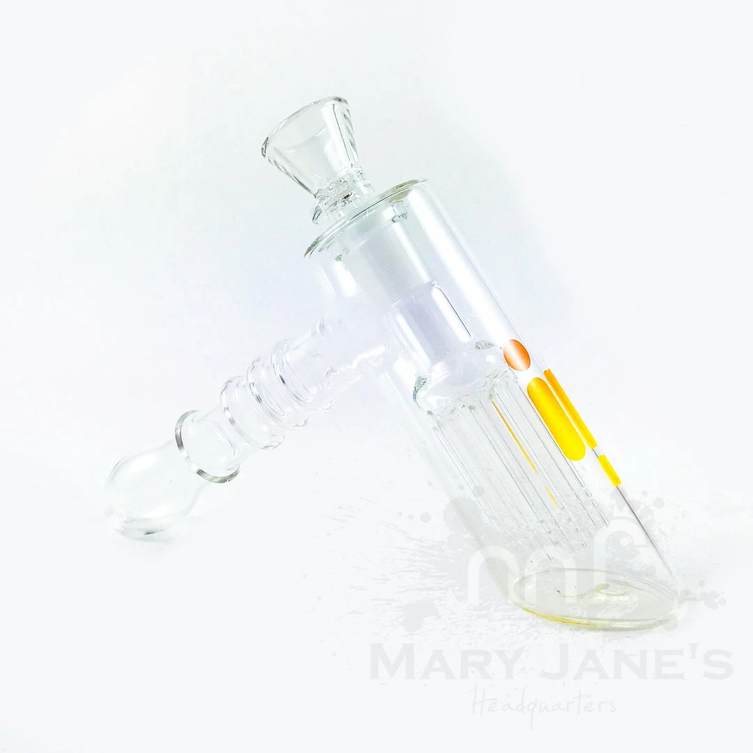 The charming Bubbler from Infyniti Glass featuresΒ a built-in reinforced downstem.Β This bubbler stands at 7″ in length and provides extreme filtration with a built in 4-arm tree percolatorΒ designed in the hammer style. This bubbler has a built-in 4 arms diffuser making it easier to use in any environment. This bubbler made with high quality borosilicate glass.Β This piece features a removable 18mm bowl for larger hits and easy cleaning.
