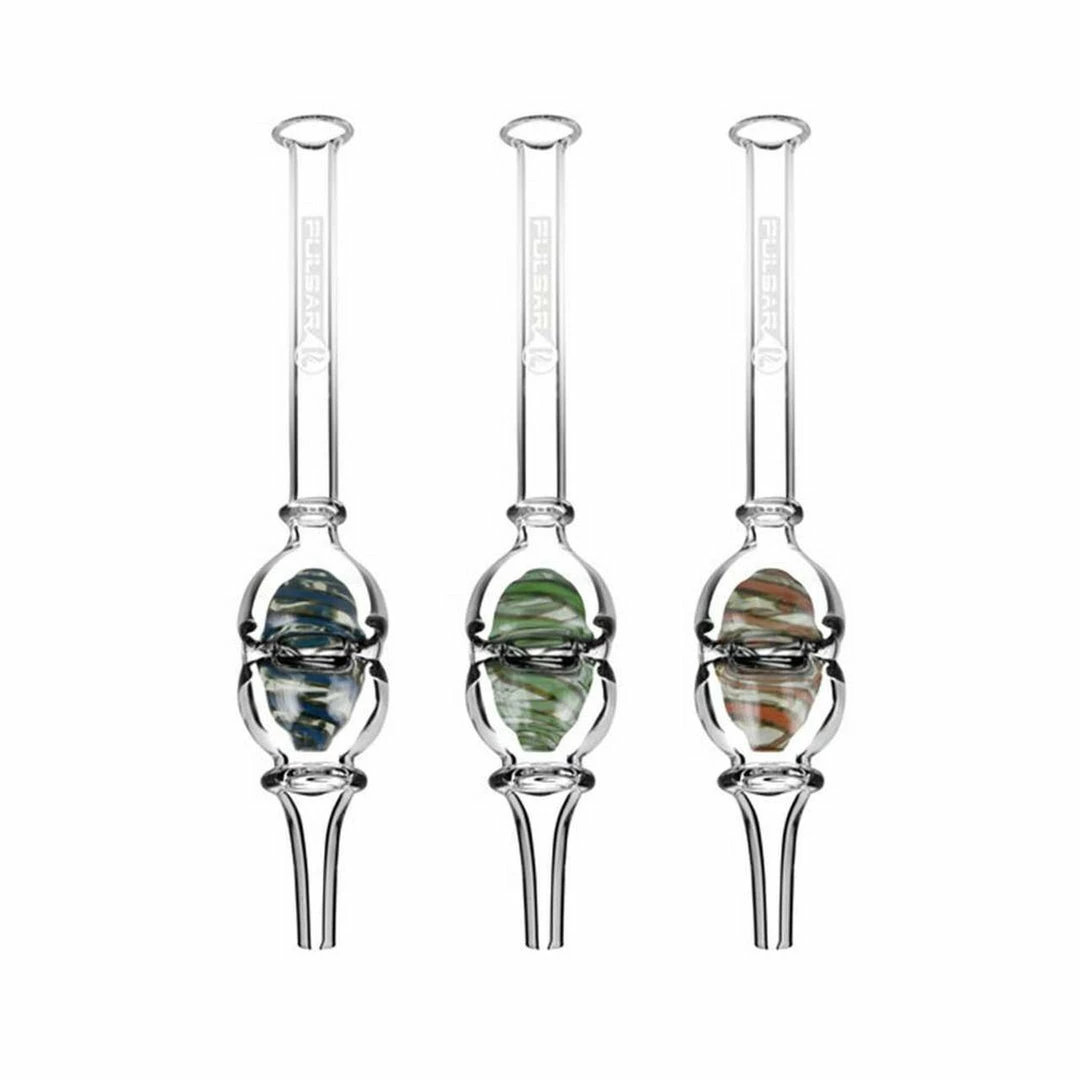The 8″ Pulsar UV Bubble Vapor Straw is a sturdy boro glass pipe with a honey tip for dabs and a colourful UV bubble inside that glows under black light (assorted colours).