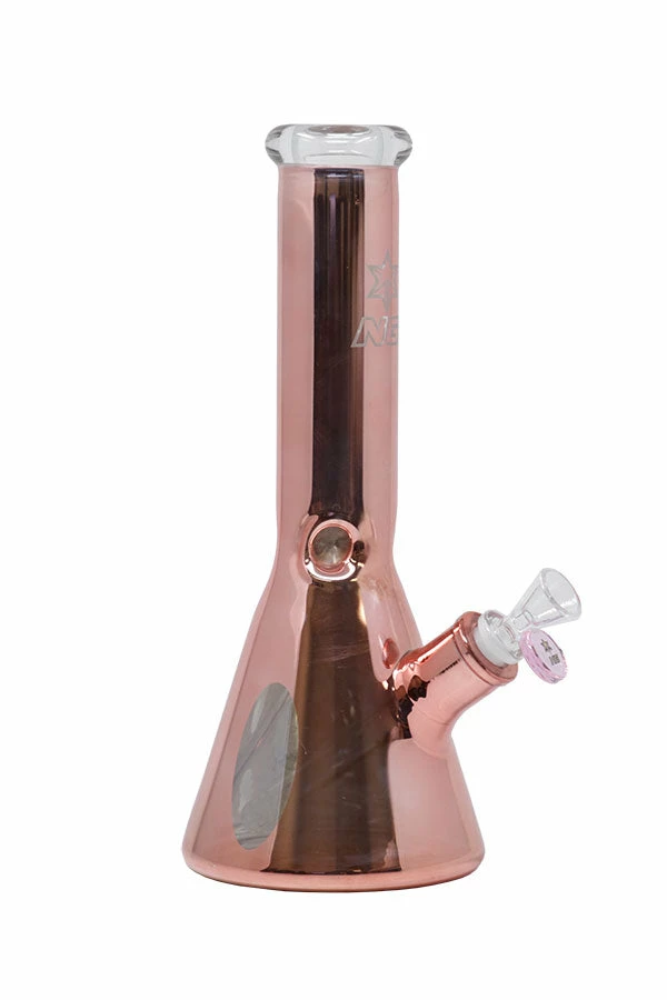 These beautiful 7mm thick beakers are wrapped in semi-transparent metallic with a clear window close to the beaker base to see the filtration in action. The mouthpiece is solid black glass and it comes with a slitted downstem, herb bowl and ice notches placed in just the right position allowing for several cubes to be inserted. It is a very sturdy classic piece with significant weight to it. Available in a range of colour options.