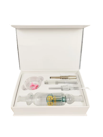 Nice 14mm Cheech Nectar collector. 2 different options, one with a showerhead perc, and one without. Both come with a quarts and a titanium tip, dish, and mouthpiece.