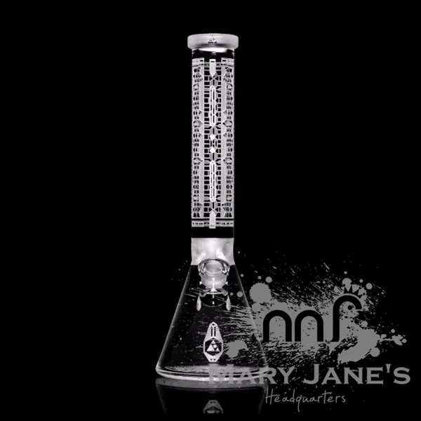 This 16โ beaker bong is inspired by shapes used in mid-15th century medieval armor used by knights. If you look closely youโll see patterns resembling swords and armor. Contains sandblasted details on the tube and base.
