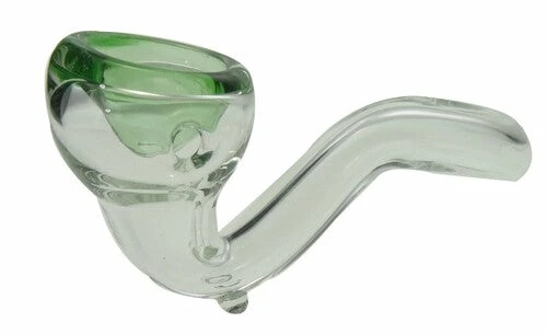 Classy and glass, this miniature pipe is shaped like Sherlocks pipe. This particular hand pipe has a little buddy attached; Aย frog just lyin’ along the pipe’s length.
