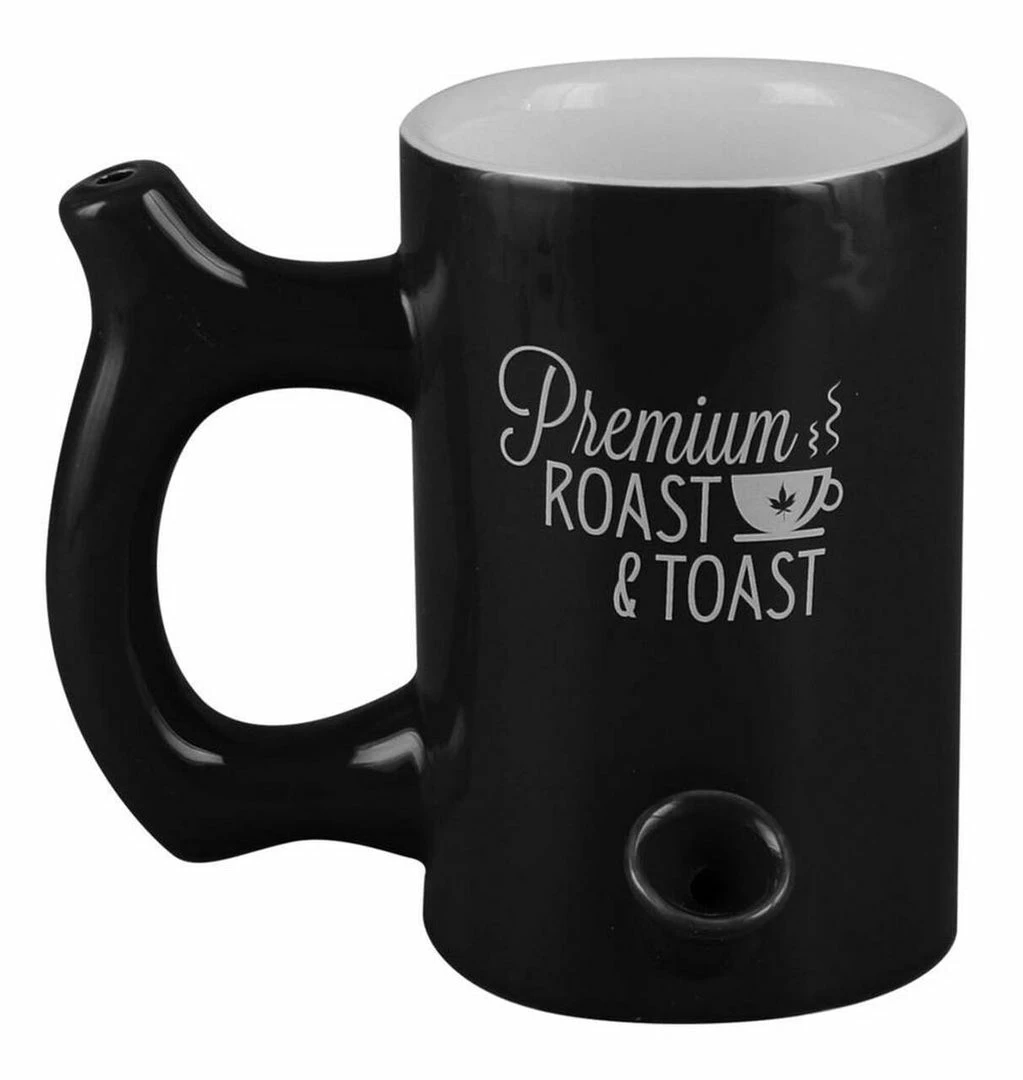 Add some fun to your morning routine with this novelty roast and toast mug. It is made from ceramic and features a standard coffee cup that can hold approx 10 oz of your favorite blend. The mug is a lovely soft plum color with a glossy finish. It has a smiling sun design with a striking white imprint. Attached to the front of the mug is a pipe where you can pack your ‘tobacco’ and light it. The smoke filters up the hollow handle to the mouthpiece on the top. Sit back, relax and enjoy your smoke and coffee.