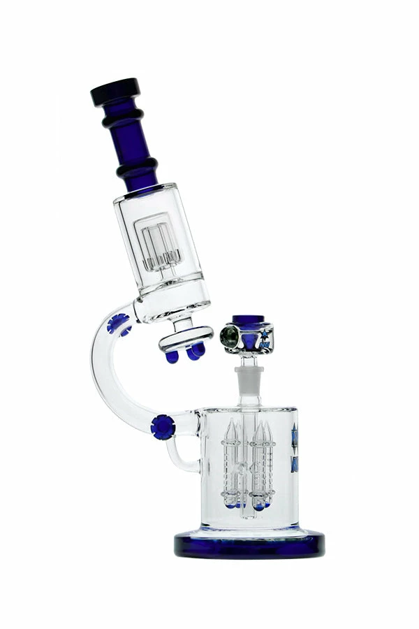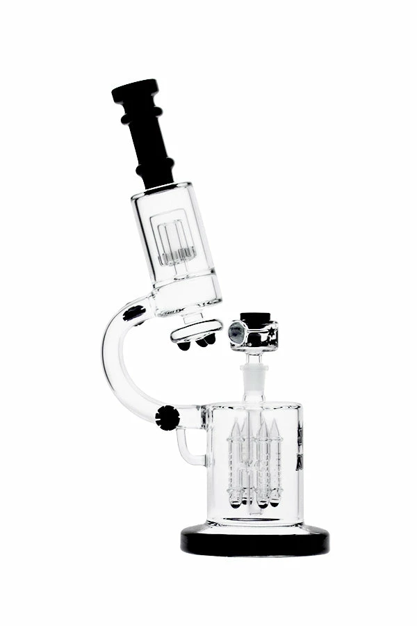 This Nice Glass stylized to resemble a microscope is the epitome of fun bongs. There are four vertical percolators with horizontal slits and a curved stem to a second chamber housing a ufo percolator with a slight tweak in the centre stem. It comes equipped with an extra thick flower bowl and available in a range of colour options.