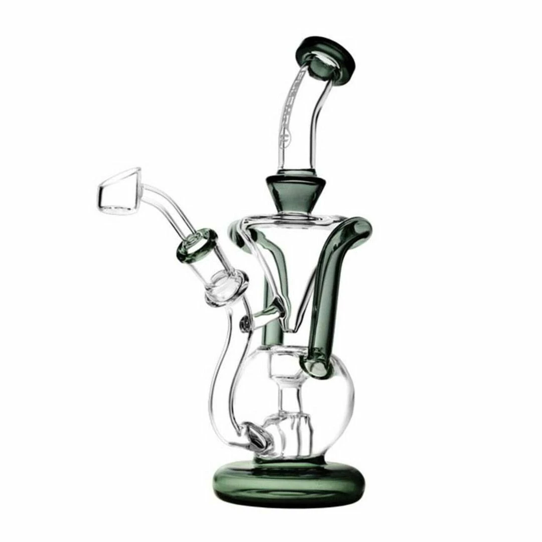 This Pulsar Gravity Ball Rig Recycler features an open cyclone drain that pours water out the bottom, through open-air and back into the perc chamber below. The water only drains when the user is not inhaling. Completely designed to prevent unwanted splashback. Stands 9.5 inches tall and comes with a quartz banger nail. Available in an assortment of colour options that may vary from what is pictured.