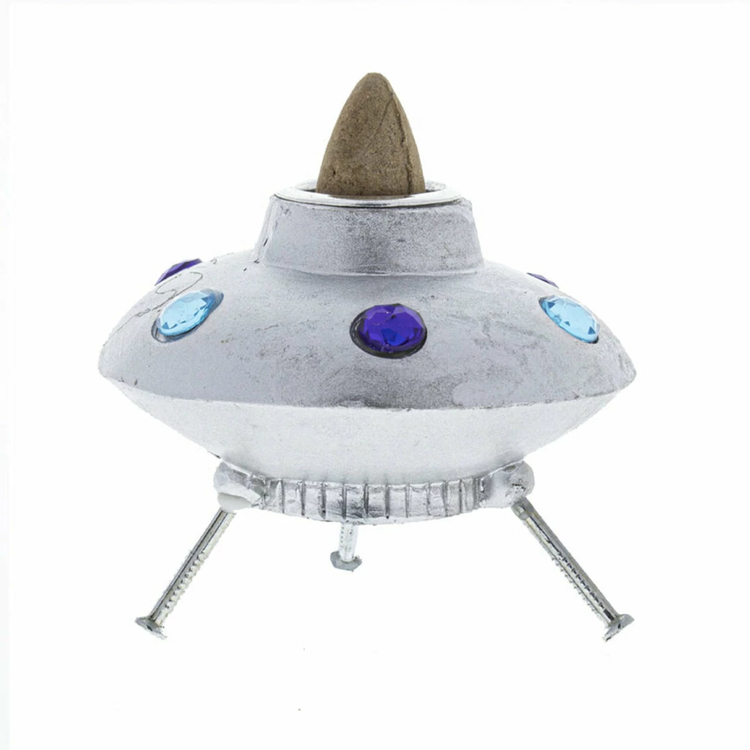 Transform your space with these flying saucer-inspiredย Spaceship Backflow Burners. Featuring a simple yet sturdy design, simply place your favourite backflow incense at the top of this burner and watch as it flows down and comes out of the bottom, gently streaming as though this spaceship was softly flying through space. Each burner comes with black felt circle to display your spaceship on which doubles as both a grip pad to keep your burner in place and also to catch the smoke as it falls.